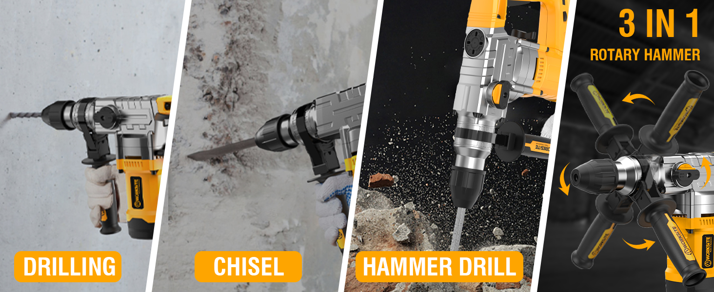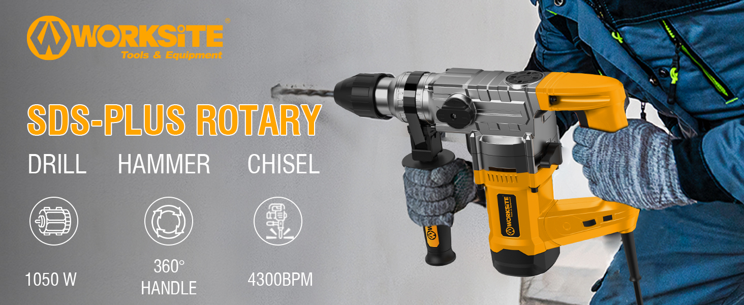 WORKSITE 1050W rotary hammer drill with 900 RPM speed, 4300 BPM impact rate,drilling capacity of 26mm in concrete, 35mm in wood, and 13mm in steel with ease for construction and renovation tasks. ✔Powerful Performance:The WORKSITE Electric Rotary Hammer Drill features a robust 1050W motor that delivers exceptional drilling power, ensuring efficient performance on various materials including steel, concrete, and wood. ✔Versatile Drilling Capacity:With a maximum working capacity of 26mm for concrete, 13mm for steel, and 35mm for wood, this professional heavy-duty rotary hammer drill is perfect for tackling diverse drilling tasks with ease. ✔High-Speed Operation:Achieve rapid results with the no-load speed of 900 RPM and impressive impact rates of up to 4300 BPM, making the WORKSITE Rotary Hammer Drill ideal for both heavy-duty construction and DIY projects. ✔Durable and Reliable Design:Built to endure demanding conditions, the WORKSITE Rotary Hammer Drill is engineered for longevity and reliability, allowing you to complete your projects without interruptions. ✔User-Friendly Features:Designed for comfort and control, this electric rotary hammer drill includes an ergonomic handle and lightweight structure, ensuring ease of use during prolonged operation while minimizing user fatigue.