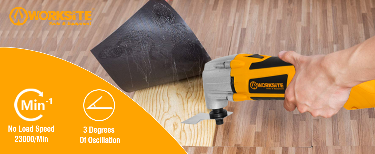 WORKSITE Oscillating Tool features a 180W motor with speeds up to 23,000 RPM, running on 220–240V/50–60Hz, ideal for precise sanding, cutting, and cleaning on wood and metal. ✔Powerful Performance:The WORKSITE Oscillating Tool features an impressive 180W motor, delivering a no-load speed of up to 23000 RPM, making it ideal for efficient cutting, sanding, and cleaning tasks. ✔Versatile Applications:This oscillating multi power tool is perfect for various materials including metal and wood, allowing you to tackle a wide range of projects with ease and precision. ✔User-Friendly Design:Designed for comfort and control, the WORKSITE Oscillating Tool ensures a secure grip and easy maneuverability, enhancing your overall experience while working on intricate tasks. ✔Reliable Power Source:With a rated voltage of 220-240V and compatibility with both 50/60Hz frequencies, this electric oscillating tool provides consistent and dependable performance. ✔Essential Tool for DIY Enthusiasts:Whether you're a professional or a hobbyist, the WORKSITE Oscillating Tool is an essential addition to your toolkit, providing versatility and power for all your sanding, cutting, and cleaning needs.