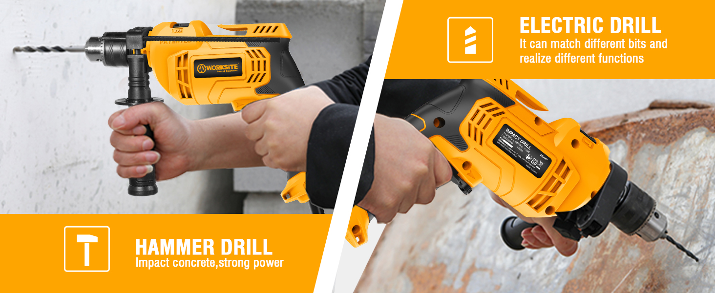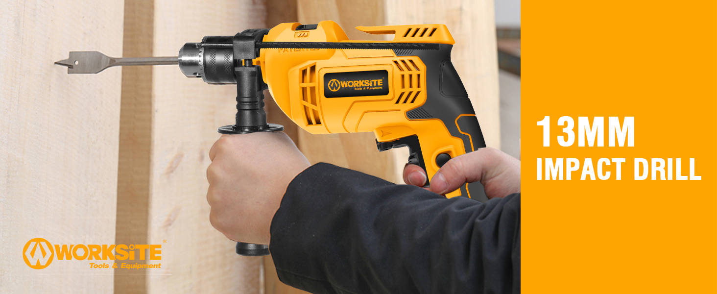 WORKSITE 710W electric impact drill with 0–3000 RPM speed, 13mm chuck, max drilling capacity of 25mm (wood), 13mm (masonry), and 10mm (steel),ideal for DIY, renovation, and light construction work. ✔Variable Speed up to 3000 RPM:Adjustable no-load speed gives you control for both precision work and heavy-duty drilling applications. ✔13mm Keyed Chuck for Versatile Bit Compatibility:Compatible with a broad range of standard drill bits, allowing easy switching for different materials and tasks. ✔Multi-Material Drilling Capacity:Drills up to 10mm in steel, 13mm in masonry, and 25mm in wood—ideal for construction, renovation, and DIY projects. ✔Lightweight Corded Design for Continuous Power:Ergonomic and portable body with a corded power source ensures stable operation and easy handling in any workspace.